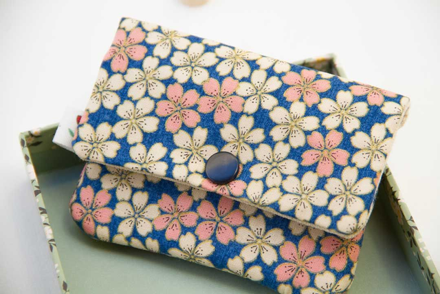 · Tela 100% algodón, exterior en fondo azul y flores sakuras en rosa y claro con toques dorados, el interior es en algodón crudo