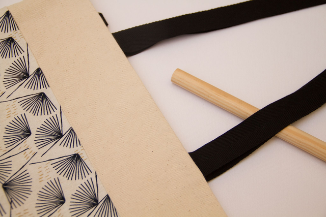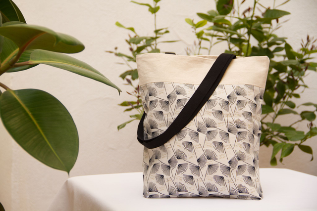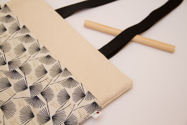 · Estampado en fondo blanco invierno con detalles en forma de abanico en azul muy oscuro y pequeños motivos en dorado, combinado con algodón en crudo, interior en algodón en crudo