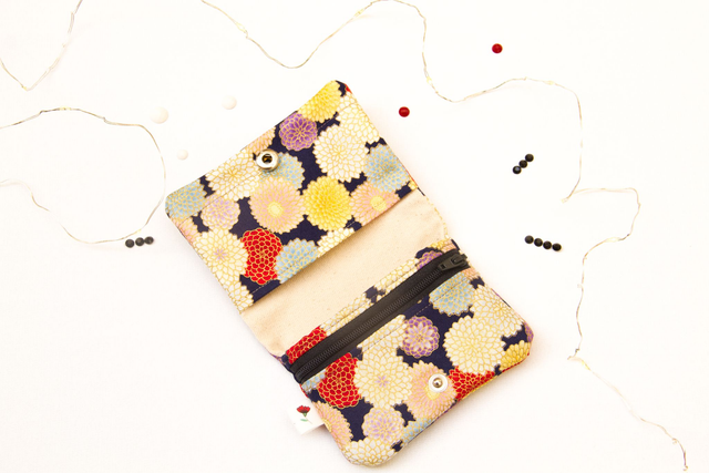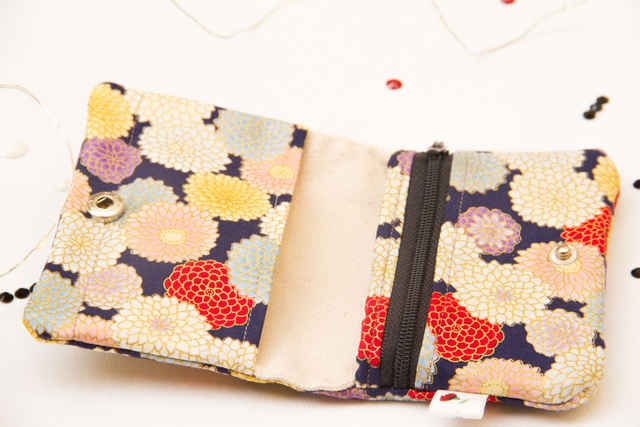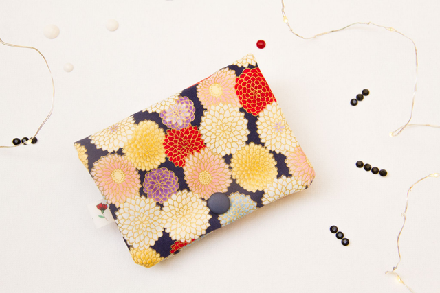 Maravillosa tela con estampado de crisantemos en tonos rosas y azules claros sobre azul marino y toques dorados, la cremallera es de color azul marino y el botón a presión de color azul marino