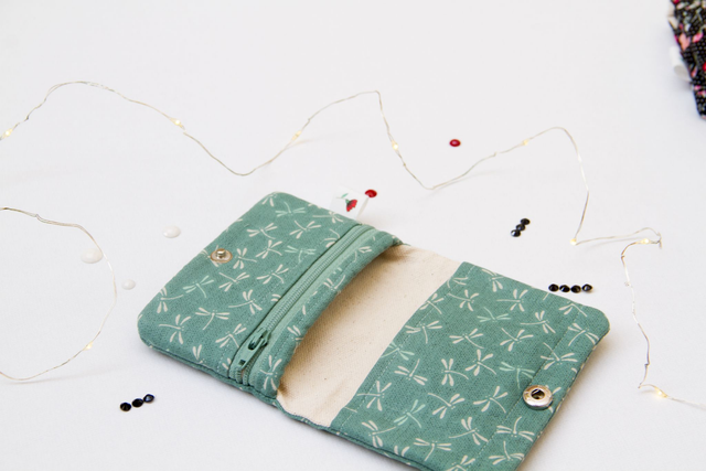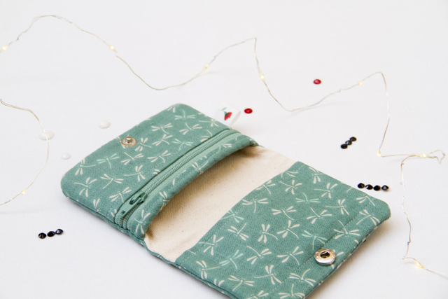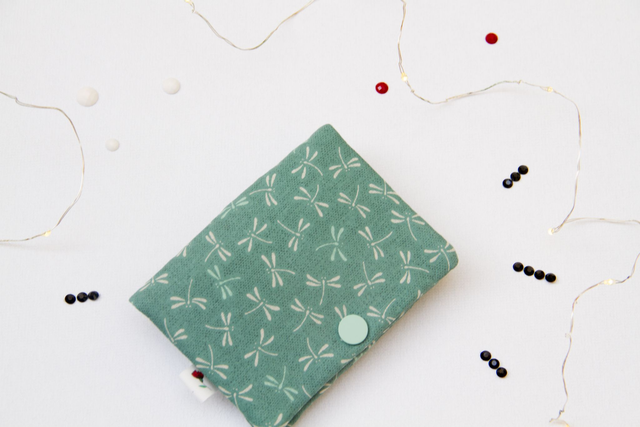 Maravillosa tela con estampado de preciosas libélulas sobre verde claro, la cremallera es de color verde claro y el botón a presión de color verde claro