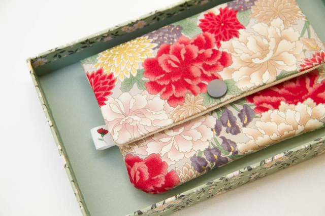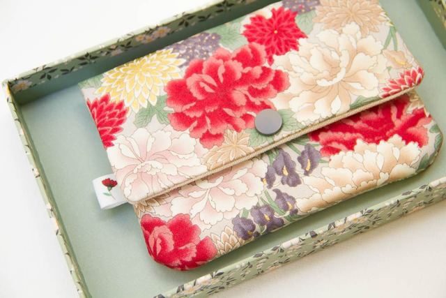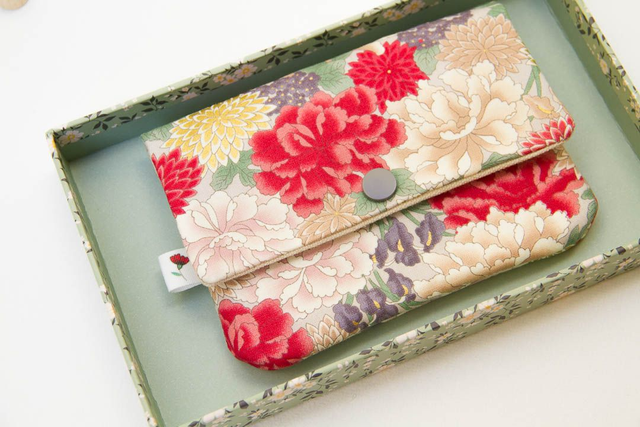 · Tela japonesa, algodón, por fuera, en diseño de flores tradicionales japonesas de colores con detalles en dorado sobre claro, por dentro combinado con tela de algodón en crudo